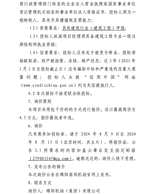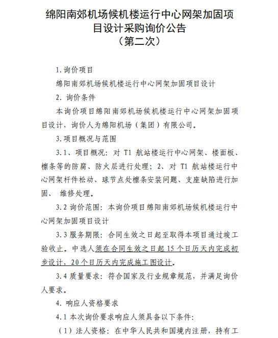 綿陽南郊機場候機樓運行中心網(wǎng)架加固項目設計采購詢價公告(第二次)
