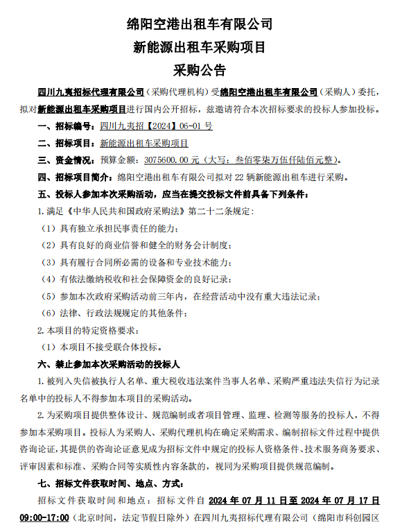 綿陽空港出租車有限公司新能源出租車采購(gòu)項(xiàng)目采購(gòu)公告